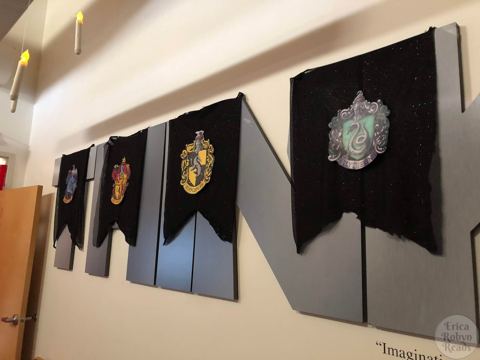 Our conference room that we turned into the great hall looked awesome! The team blacked out the windows and we had things all over the place; floating candles, flickering table candles, owls, howlers, house banners, and more! We also turned the electric fireplace on and had Harry Potter playing on the TV.