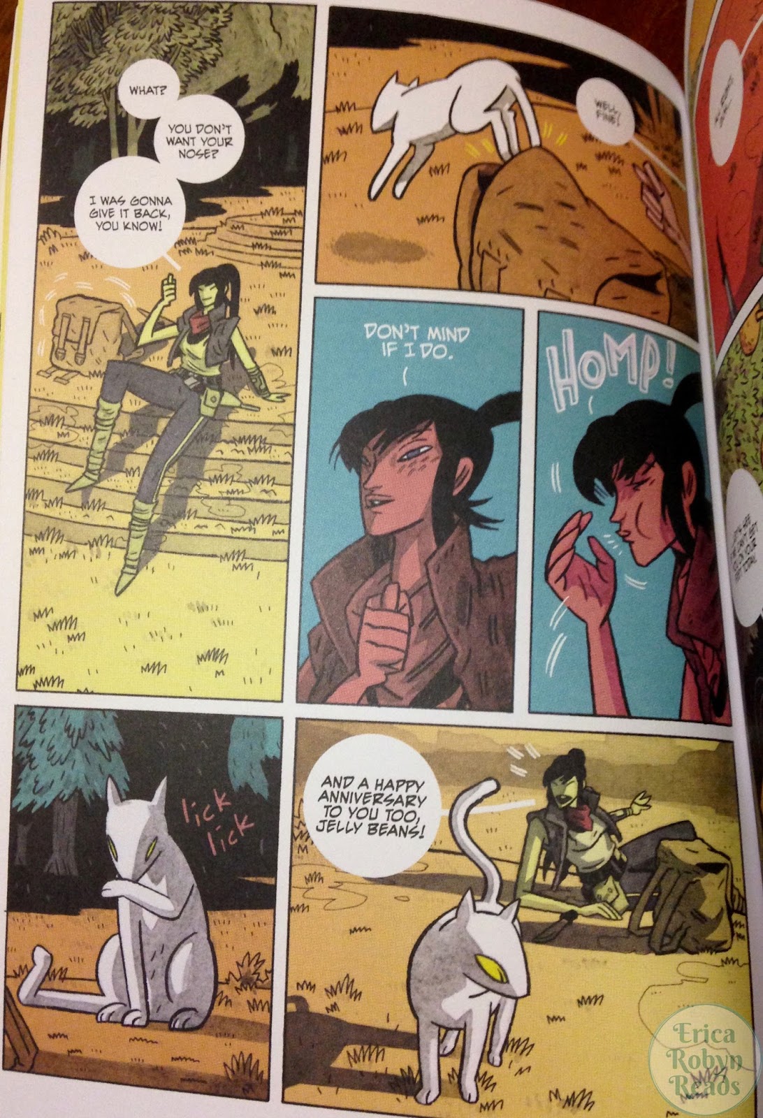 This graphic novel is about a girl named Aria living in a Post Apocalyptic world with her cat, Jelly Beans. She is trying to find something that her tracker keeps picking up on briefly before the signal disappears again. One day she sees a young man and flees. She immediately regrets it, knowing that he is going to bring his people there to search for her, but she gets stuck in thinking about the fact that he was just a boy. Sure enough, they come back. But will Aria be able to fight all of them off so she can live to complete her mission?