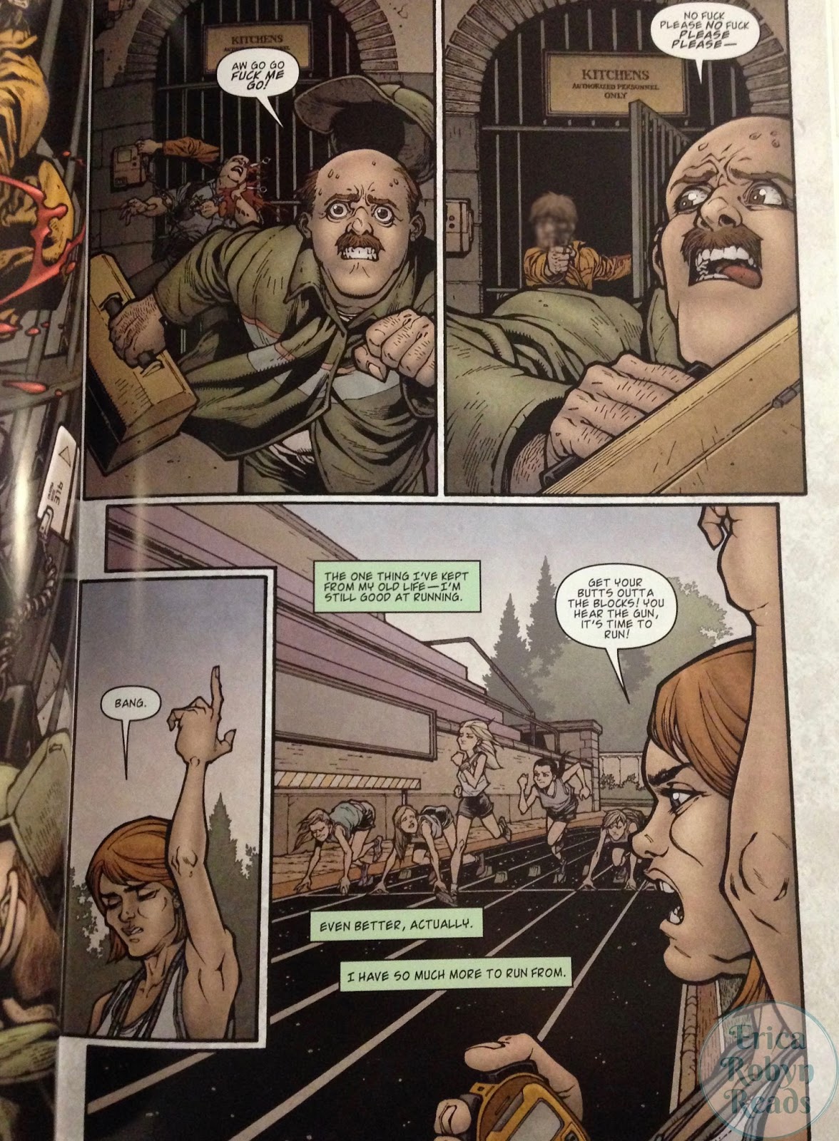 The flow of this collection was also wonderful. Whether it was a chapter break or a setting jump on the same page, you can tell that the transitions were really thought out, and therefore they were executed perfectly. For example, on one page we see a character about to shoot a gun in one panel, and then in the next a track coach is pointing her hand in the air and shouting “bang” to start a race (image below, face blurred to prevent spoilers).
