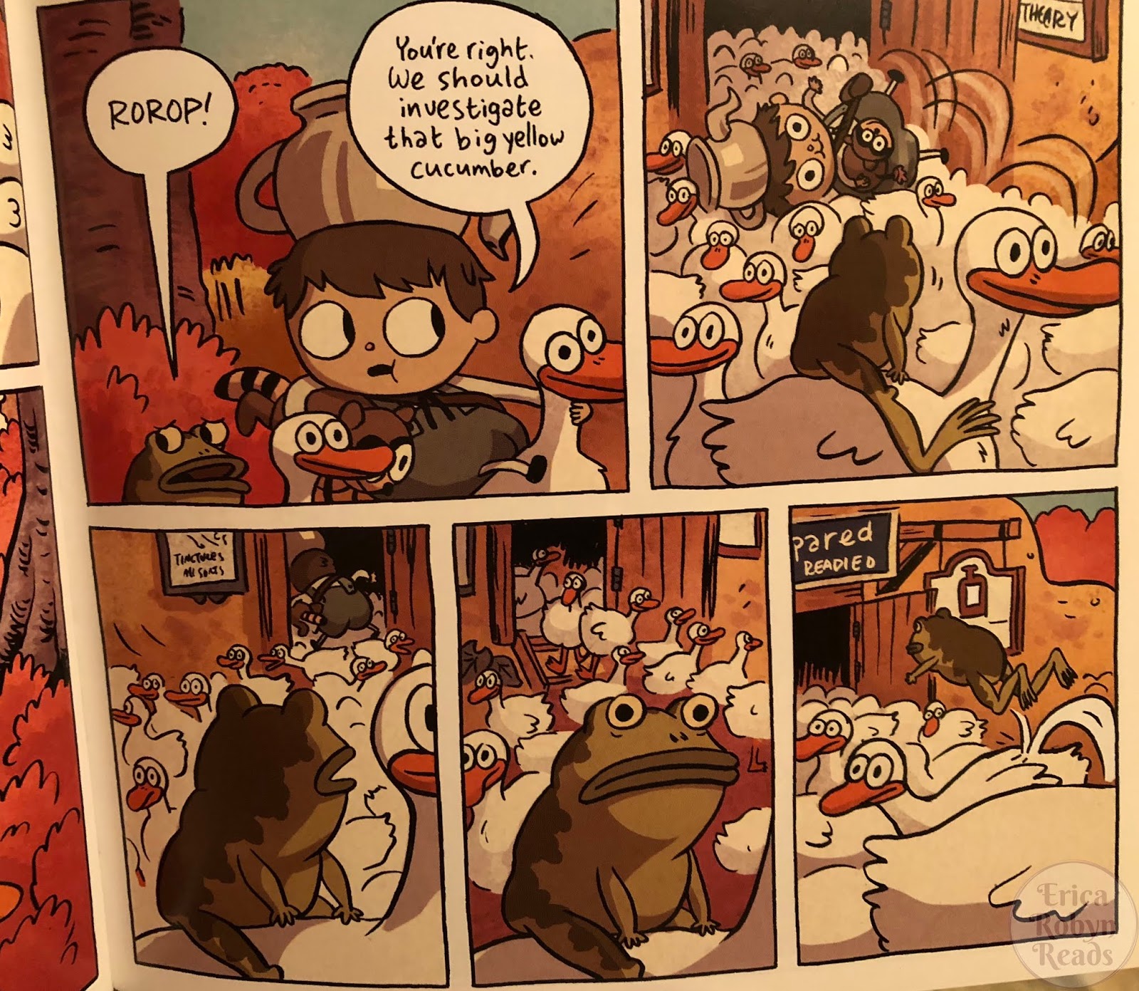I loved the frog, Sheriff Funderberker. Throughout the story, he was guiding Greg along. Seeing the frogs facial expression on each panel was too funny! In one instance he even broke with fourth wall and looked at the audience like, “oh here we go…”
